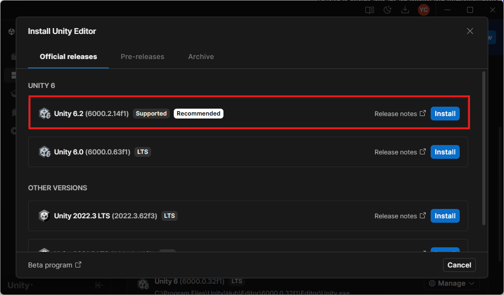 Official releases의 UNITY 6 버전을 선택하고 우측 Install버튼을 눌러 진행합니다.